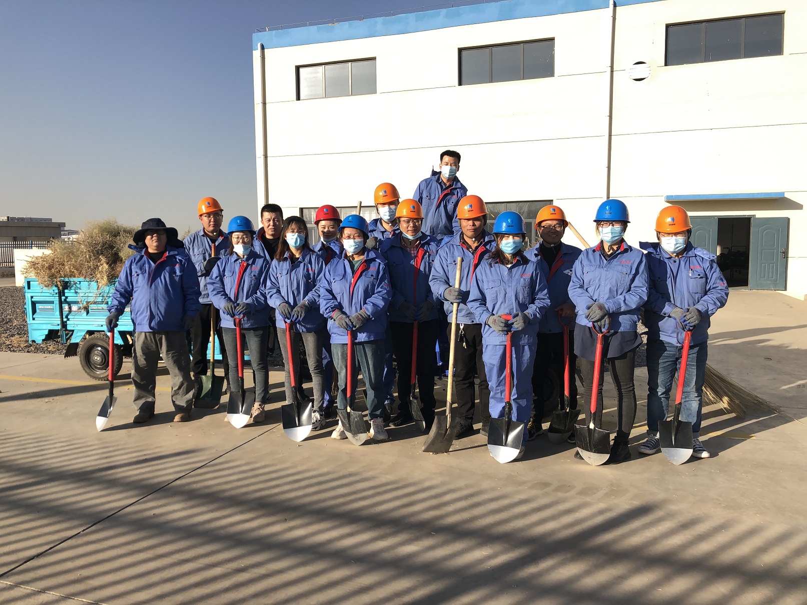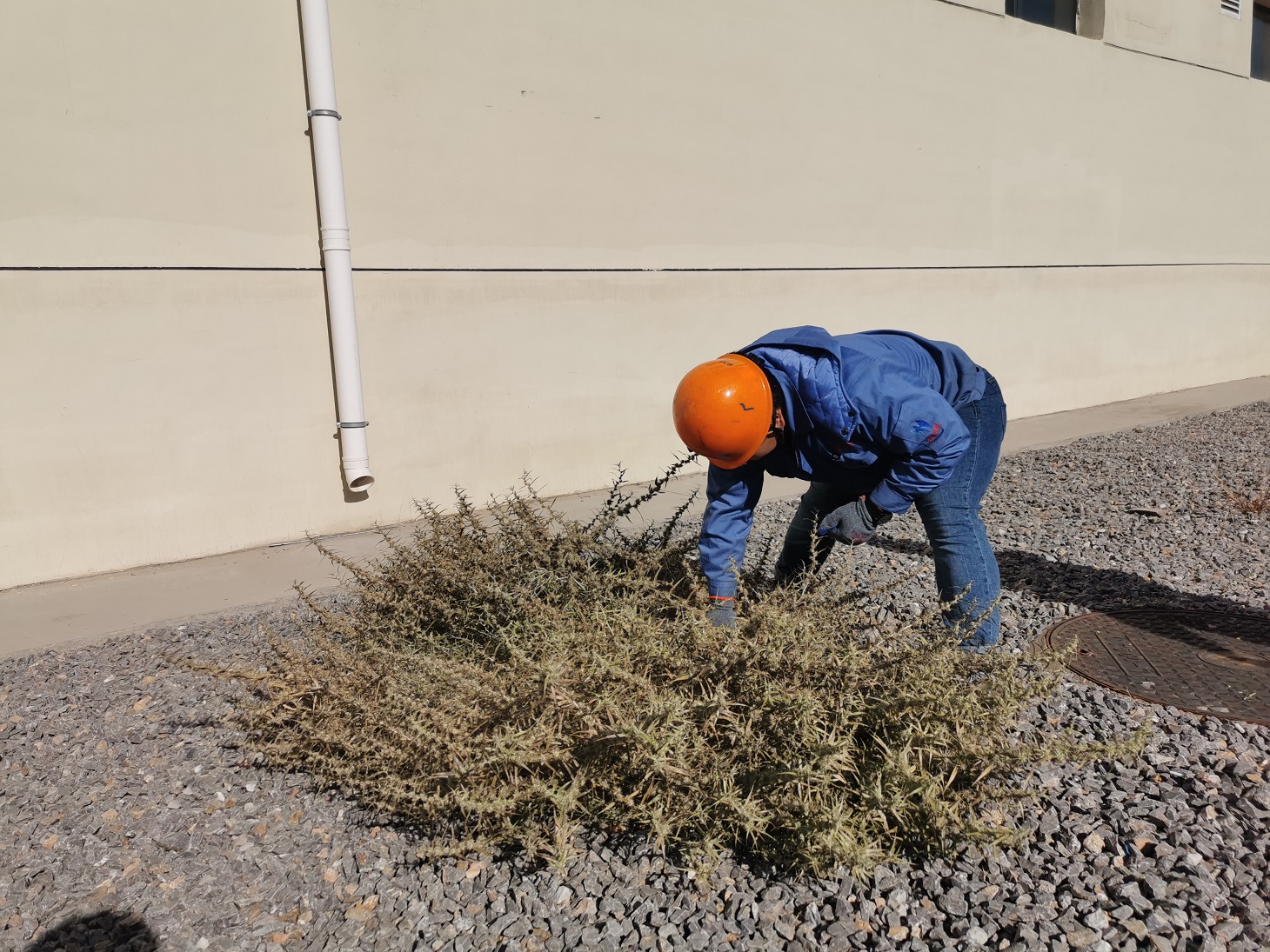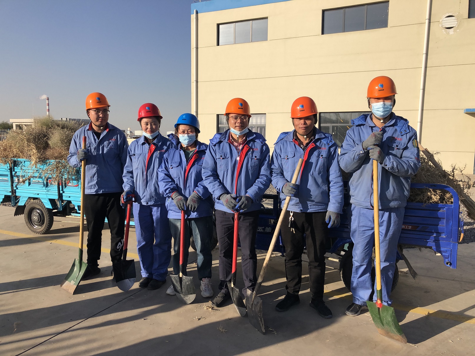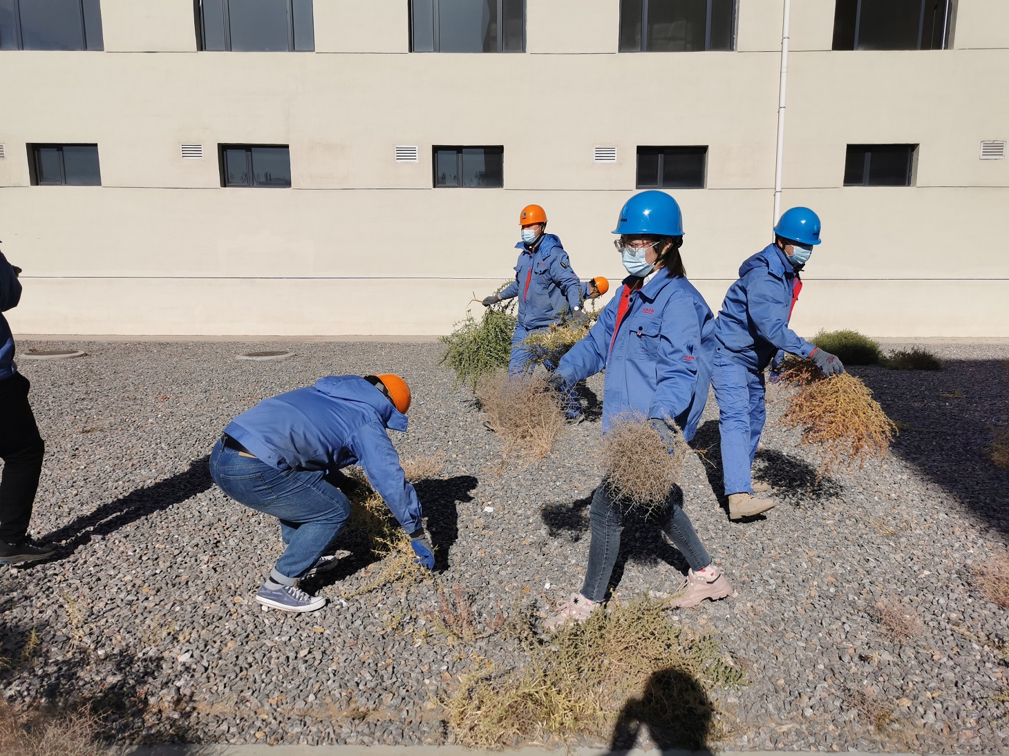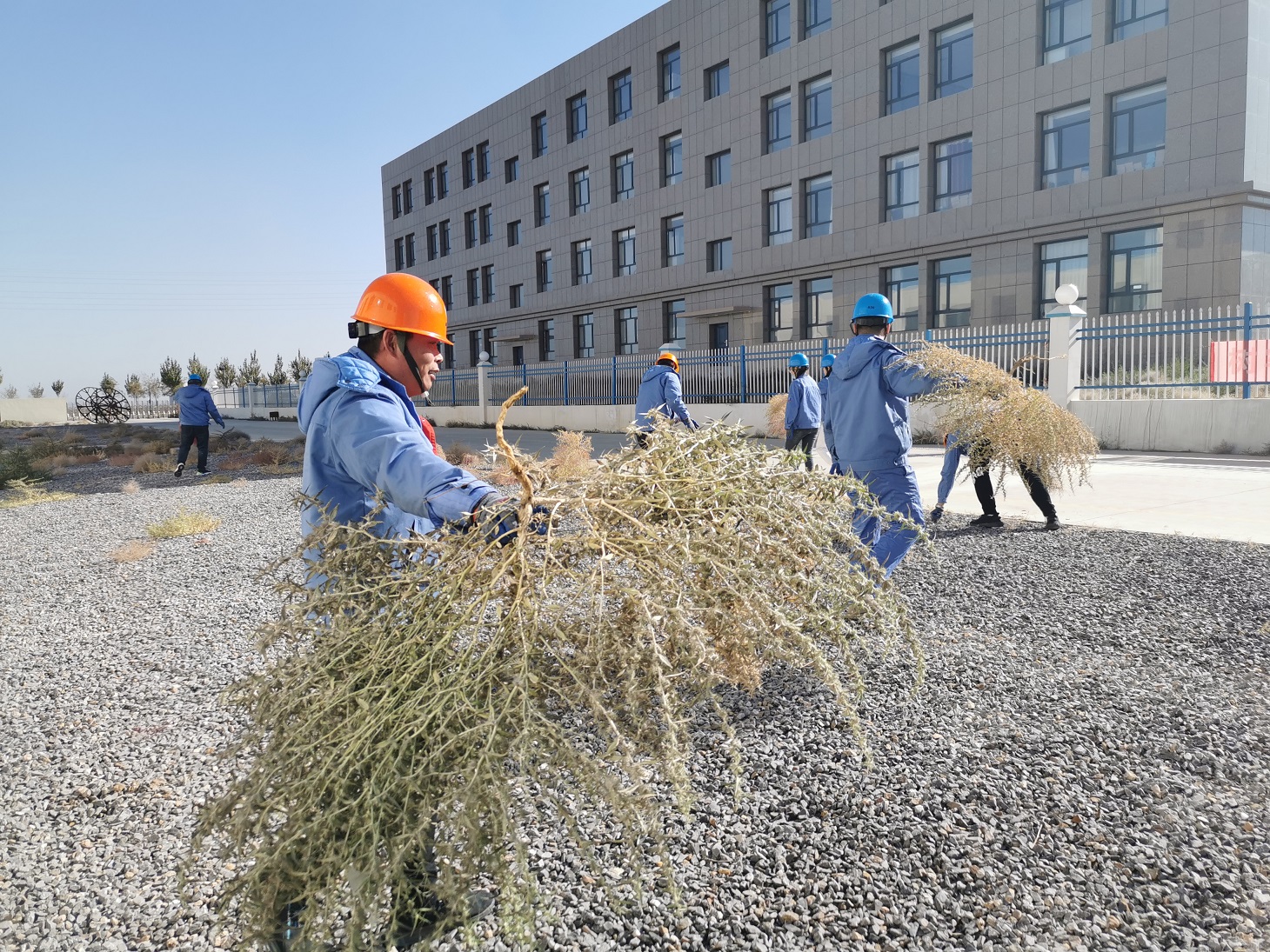 為防患于未然,黨支部和工會決定對這類枯草展開全面清理。十月下旬的阿拉善,寒風已有些刺骨,而生長于沙漠戈壁地帶的草類莖干強硬且帶刺,清理不易。盡管如此,全體黨員和工會骨干不怕苦,不畏難,積極發揮帶頭作用,為漸入寒冬的漫漫戈壁增添了一抹亮麗的黨旗紅。
