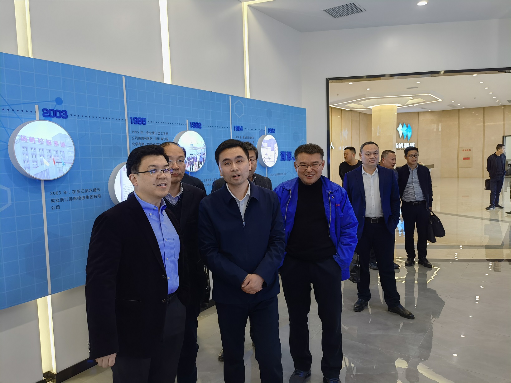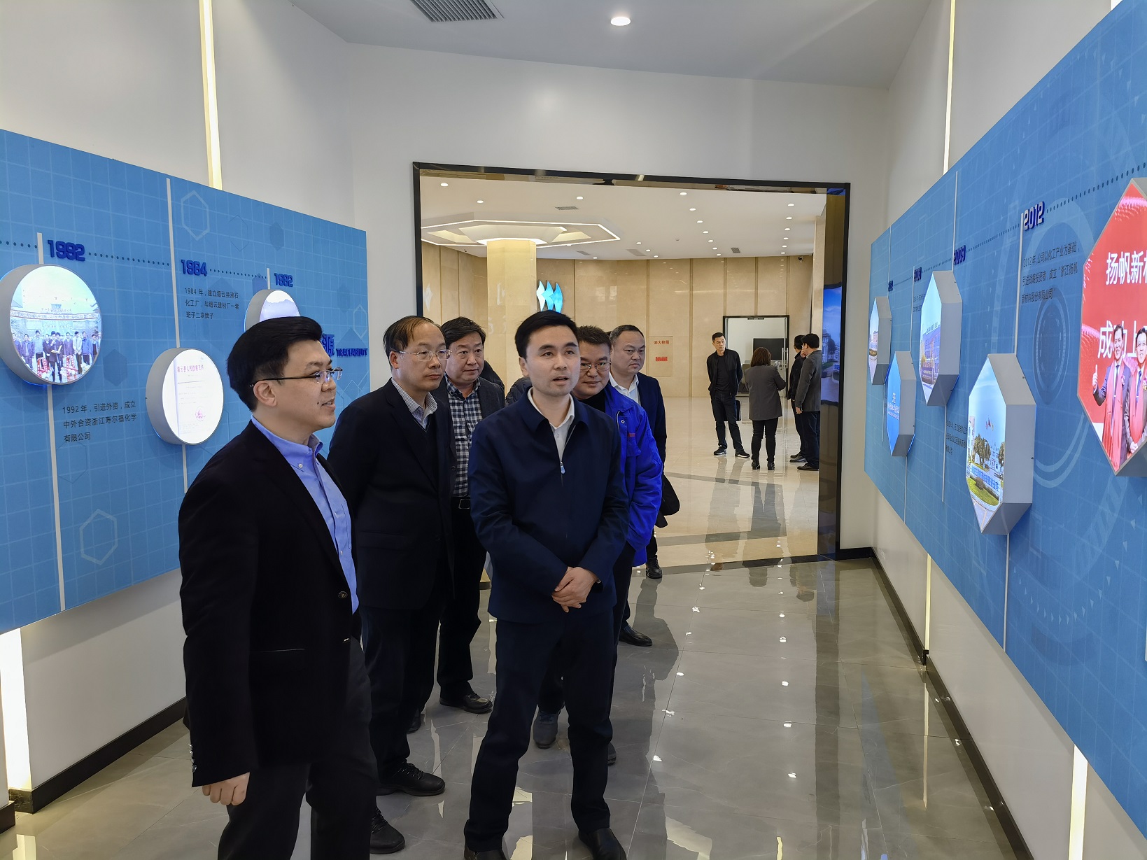 金區(qū)長一行在樊董的陪同下參觀了企業(yè)發(fā)展(產(chǎn)品)展示廳和黨建展廳。