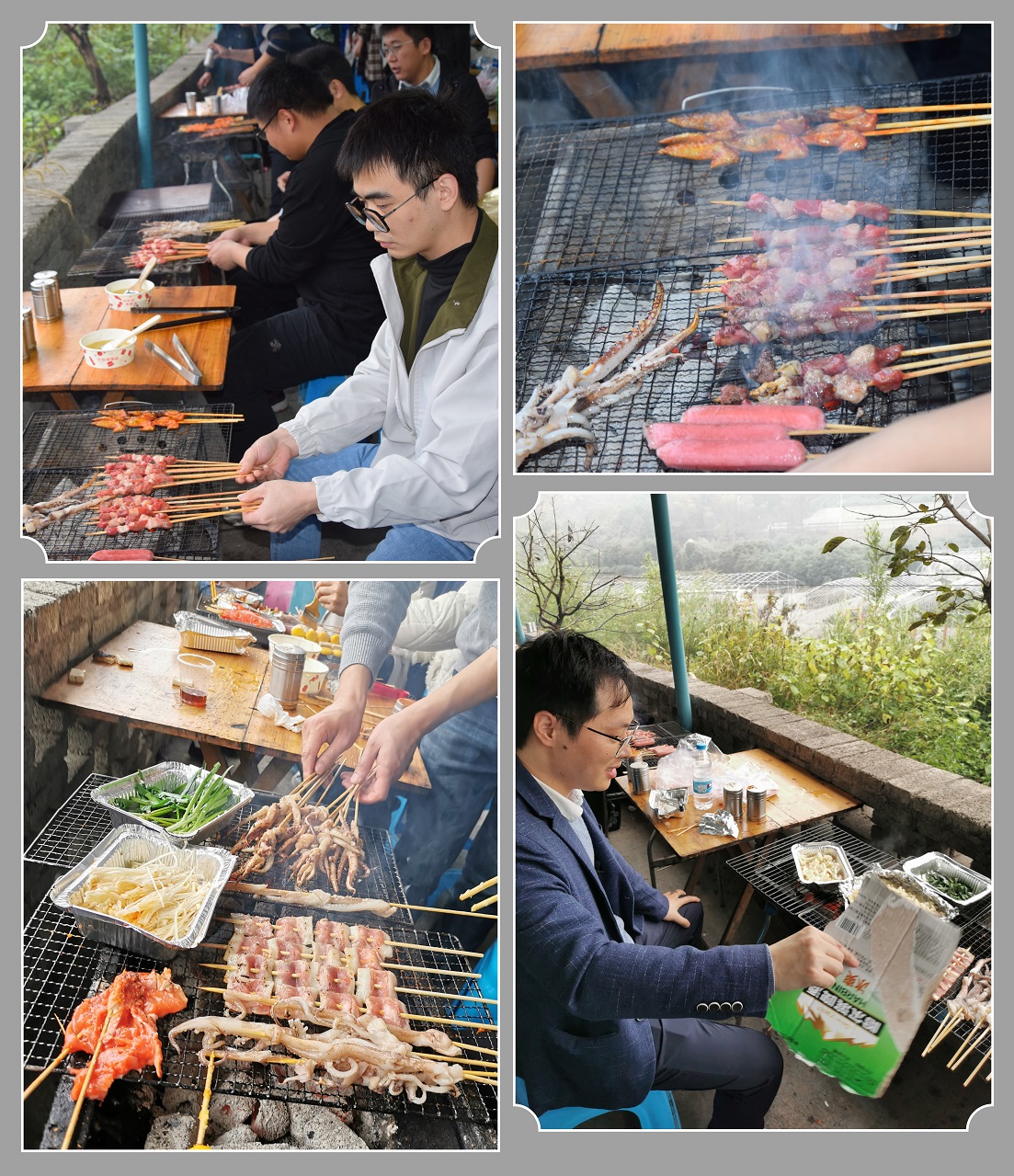 午餐原定的草坪天幕燒烤因為一場小雨的降臨轉到了室內,但這絲毫沒有澆滅大家的熱情。小伙伴們紛紛大展身手,秀出自己的手藝,大家分工協作,有的負責配制食材,有的負責烤制食物,伴著燒烤的香味,在這雨后的氤氳山水間分享美食,暢聊趣事,其樂無窮。